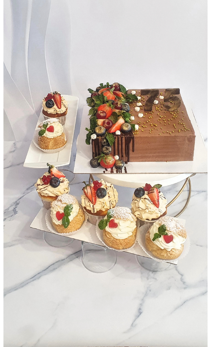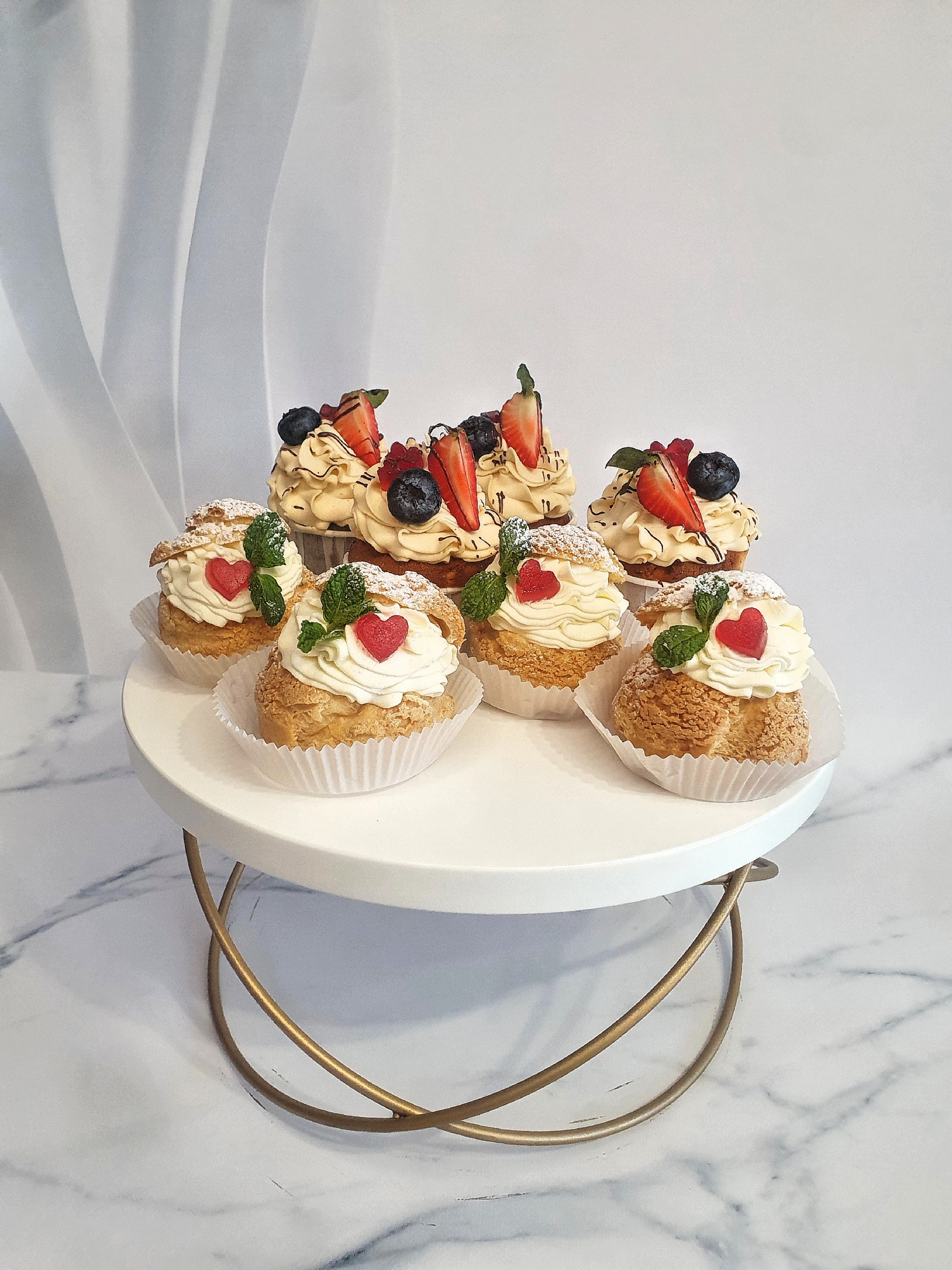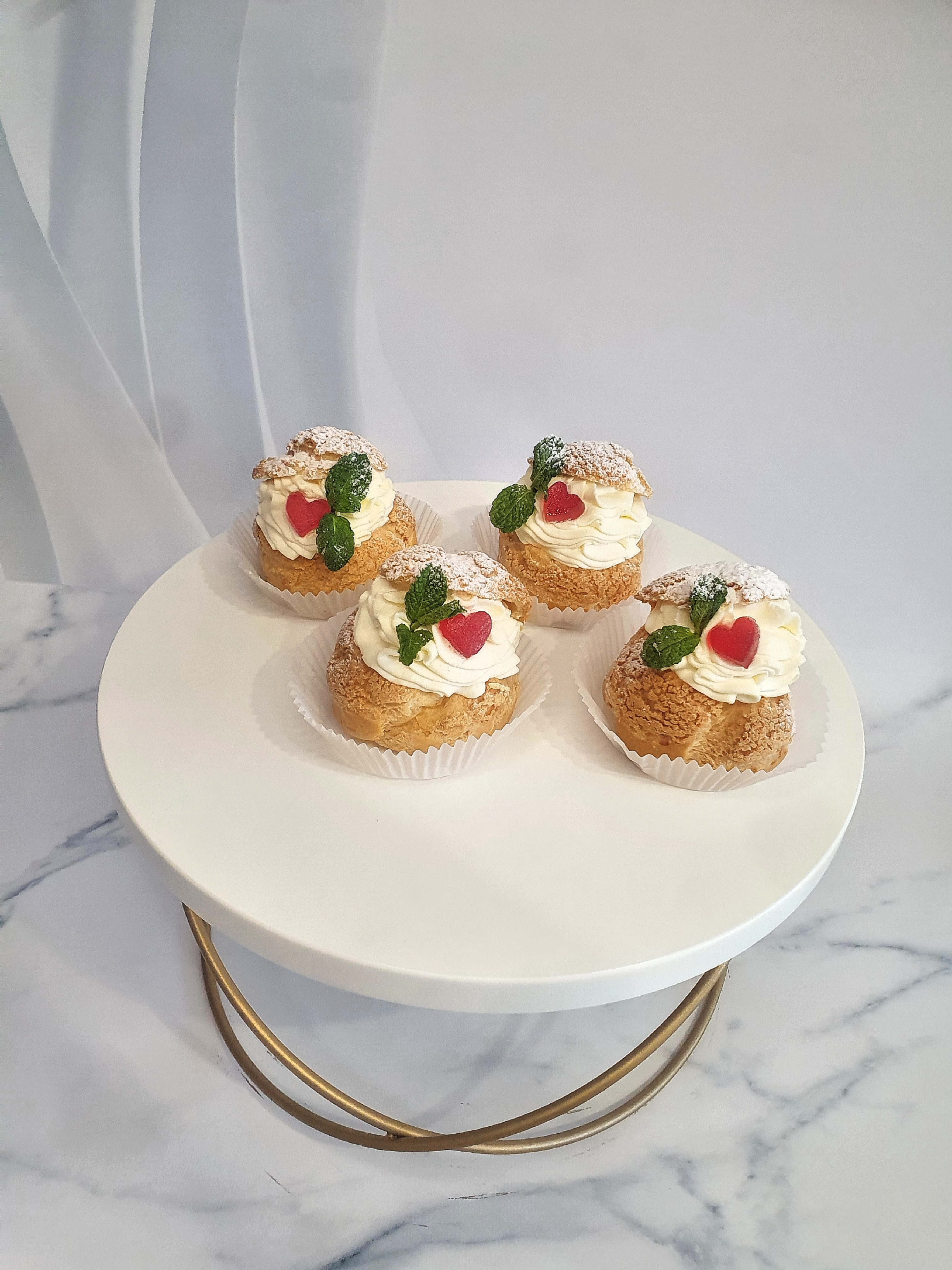 Воздушные пирожные с насыщенным карамельным кремом и нежными взбитыми сливками. Внутри — свежая малина, добавляющая лёгкую кислинку. Украшение мармеладным сердечком и веточкой мяты придаёт десертам утончённый праздничный вид.