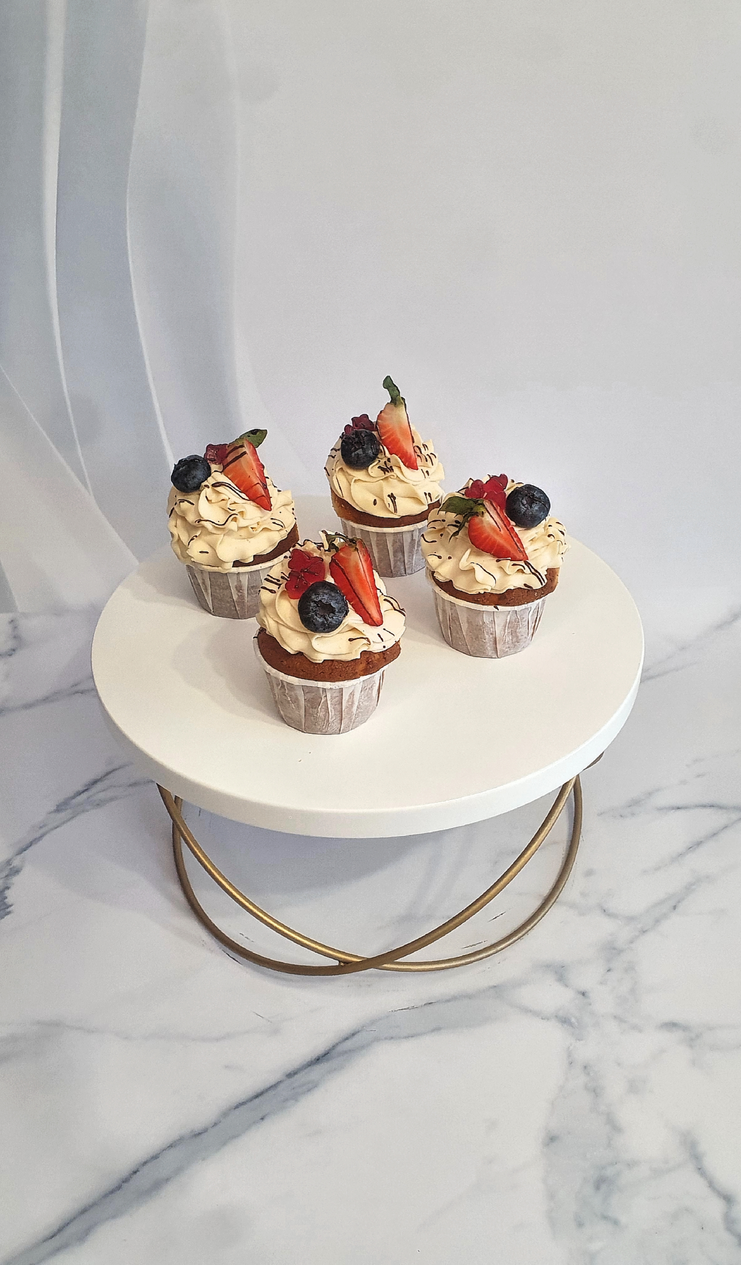 Нежные ванильные капкейки с клубничной начинкой и карамельным кремом. Декорированы свежими ягодами — красиво, аккуратно и очень аппетитно.